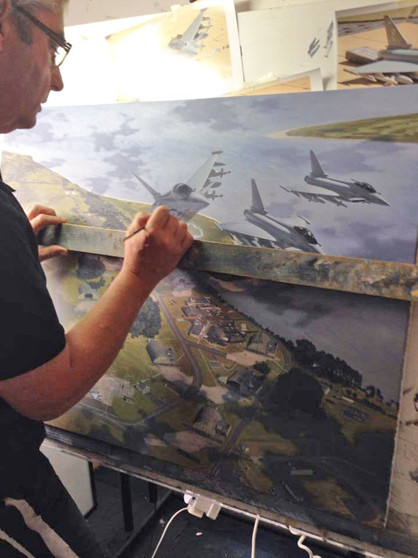 Now, after getting my name and reputation out in a few places, I have done some really interesting work for a variety of people, which I think my gallery of prints shows. Small private aircraft, large passenger airliners, wartime fighters and bombers, fixed wing and rotary wing. Some have been for private individuals, some for large companies. I find working for active service squadrons an honour and a pleasure, and particularly enjoy talking to the aircrew about the painting they want, and their reaction to the finished thing. I like the thought of contributing on canvas to the recording of their history, as this is often the purpose of the commission. I have been lucky enough to work with the USAF, as well as the Army Air Corps and the RAF in the United Kingdom.